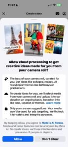 ถ้าผู้ใช้กดยอมรับ Facebook จะดูรูปในคลังรูปภาพเพื่อแนะนำการสร้างเนื้อหา เช่น สร้างคอลลาจ คลิปสรุป หรือปรับแต่งรูปด้วย AI ตามธีม เช่น วันเกิด หรือสถานที่ การอนุญาตนี้ยังหมายถึงให้ Facebook อัปโหลดรูปจากโทรศัพท์ไปยังเซิร์ฟเวอร์อย่างต่อเนื่อง โดยดูจากข้อมูล เช่น วันที่ หรือสถานที่.