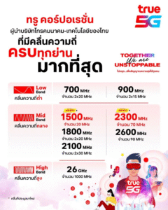 - ตอกย้ำความเป็นผู้นำ ของทรู คอร์ปอเรชั่น ด้วยการมีชุดคลื่นความถี่ครบทั้งย่านต่ำ-กลาง-สูง รวม 8 ย่าน รองรับการให้บริการ 5G, 4G, IoT และ AI ทั่วประเทศ